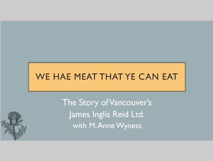 Design of PowerPoint presentation for author talk by M. Anne Wyness for Larder of the Wise: the Story of Vancouver's James Inglis Reid Ltd.to the Vancouver Historical Society.